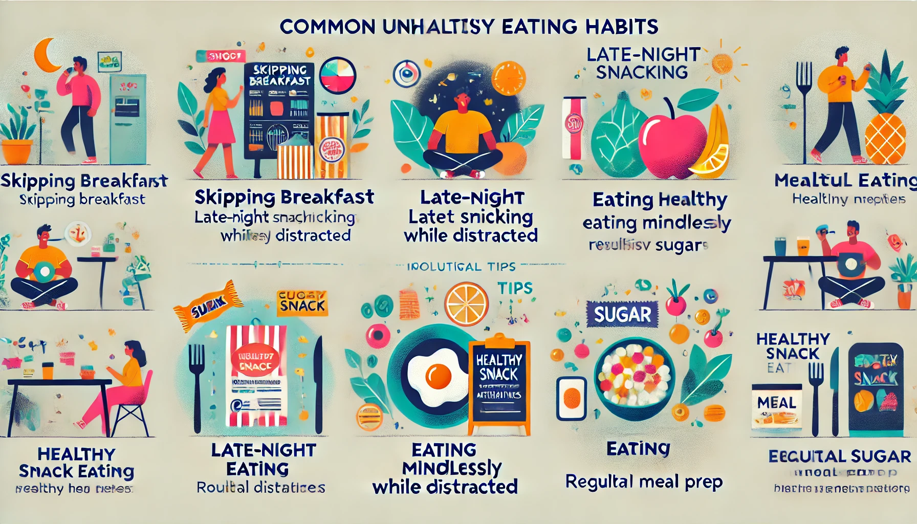 바쁜 현대사회에서는 알게 모르게 여러 가지 좋지 않은 식습관이 자리 잡기 쉽습니다. 대표적으로 흔히 볼 수 있는 몇 가지 예는 다음과 같습니다.